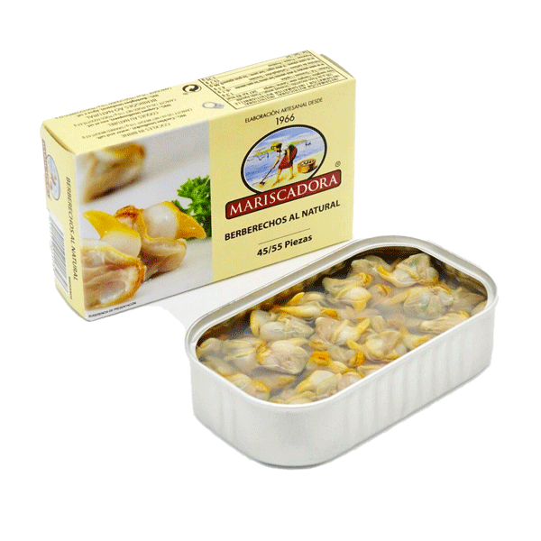 Berberechos gallegos seleccionados con riguroso control de calidad, depurados y envasados al natural para preservar su esencia marina. Con 45-55 piezas por lata, estos moluscos destacan por su textura excepcionalmente tierna y su sabor auténtico que evoca las costas gallegas. Un producto gourmet tradicional, imprescindible en la gastronomía española de calidad.