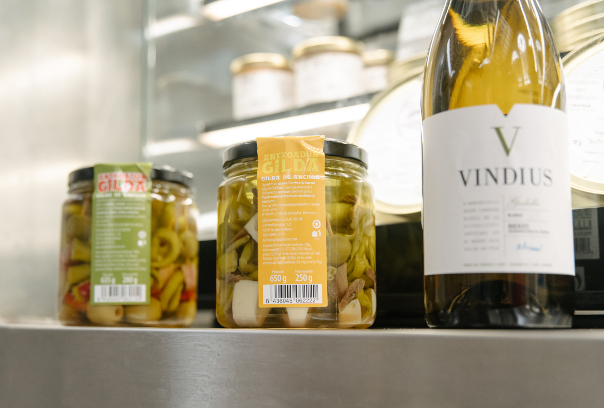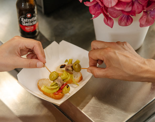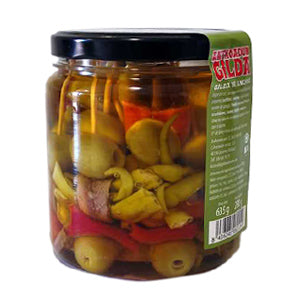 La gilda clásica con alegría es una típica tapa vasca que combina una aceituna, un trozo de anchoa, una guindilla y un troz de pimiento picante rojo en un pincho, creando un sabor único y refrescante. Está inspirada en la tradición y la cultura vasca, y es perfecta para aquellos que buscan una experiencia gastronómica auténtica.